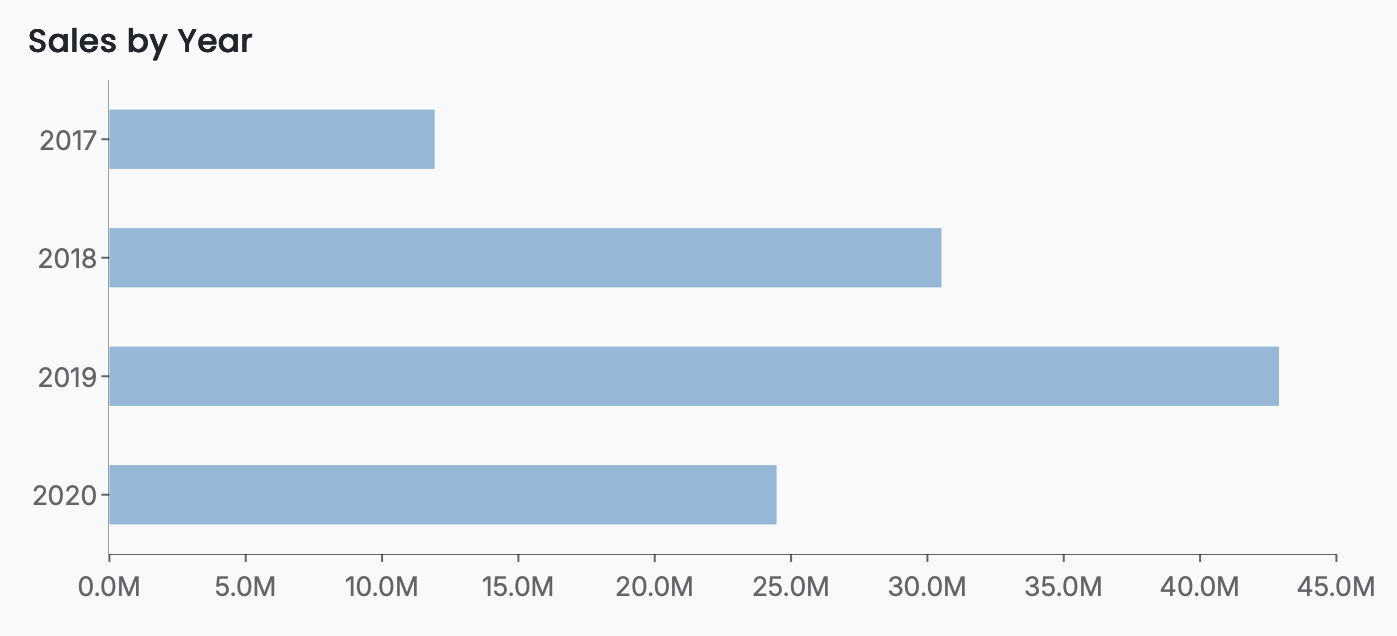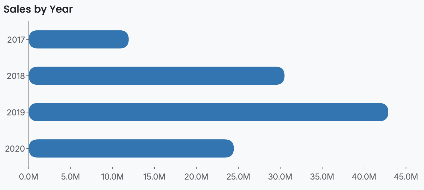 Bar charts are a visualization used to display data across categories using horizontal bars. You can use bar charts when you want to emphasize category names, accommodate longer labels, or compare values side-by-side with a layout that is easier to read than vertical columns. Bar charts support grouped, stacked, percent stacked, and trellised configurations, giving you flexibility to analyze multiple dimensions simultaneously. This article explains the requirements for creating a bar chart and outlines the key properties that determine its layout, formatting, and interactive behavior.