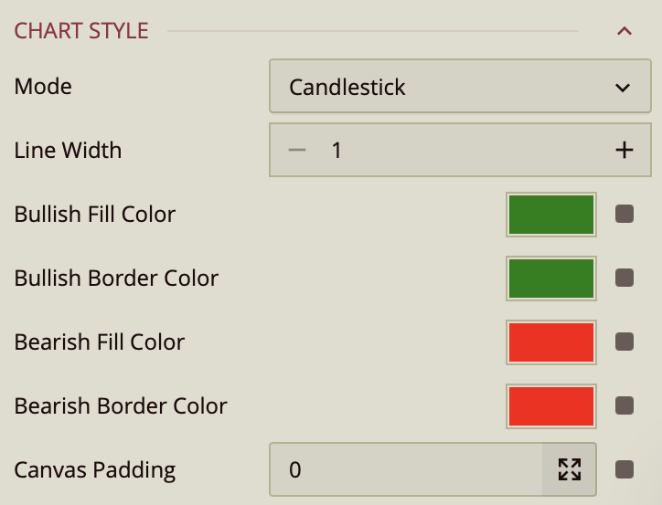 Candlestick charts in Wyn can be extensively styled and configured using the Inspector panel. Below are key settings you can modify: