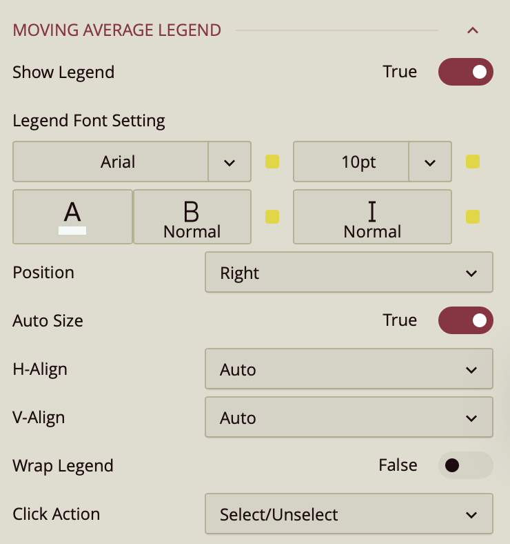 The legend is set to Auto Size by default. To manually define the legend size, disable this setting by setting Auto Sizeto False. You can also control the Horizontal and Vertical Alignment, which are both set to Auto by default but can be changed using dropdown options. To allow legend labels to wrap across lines, set the Wrap Legend option to True.