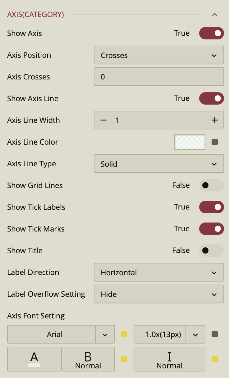 Axis Line Width / Color / Type – Control the thickness, color, and style (solid or dashed) of the axis line.