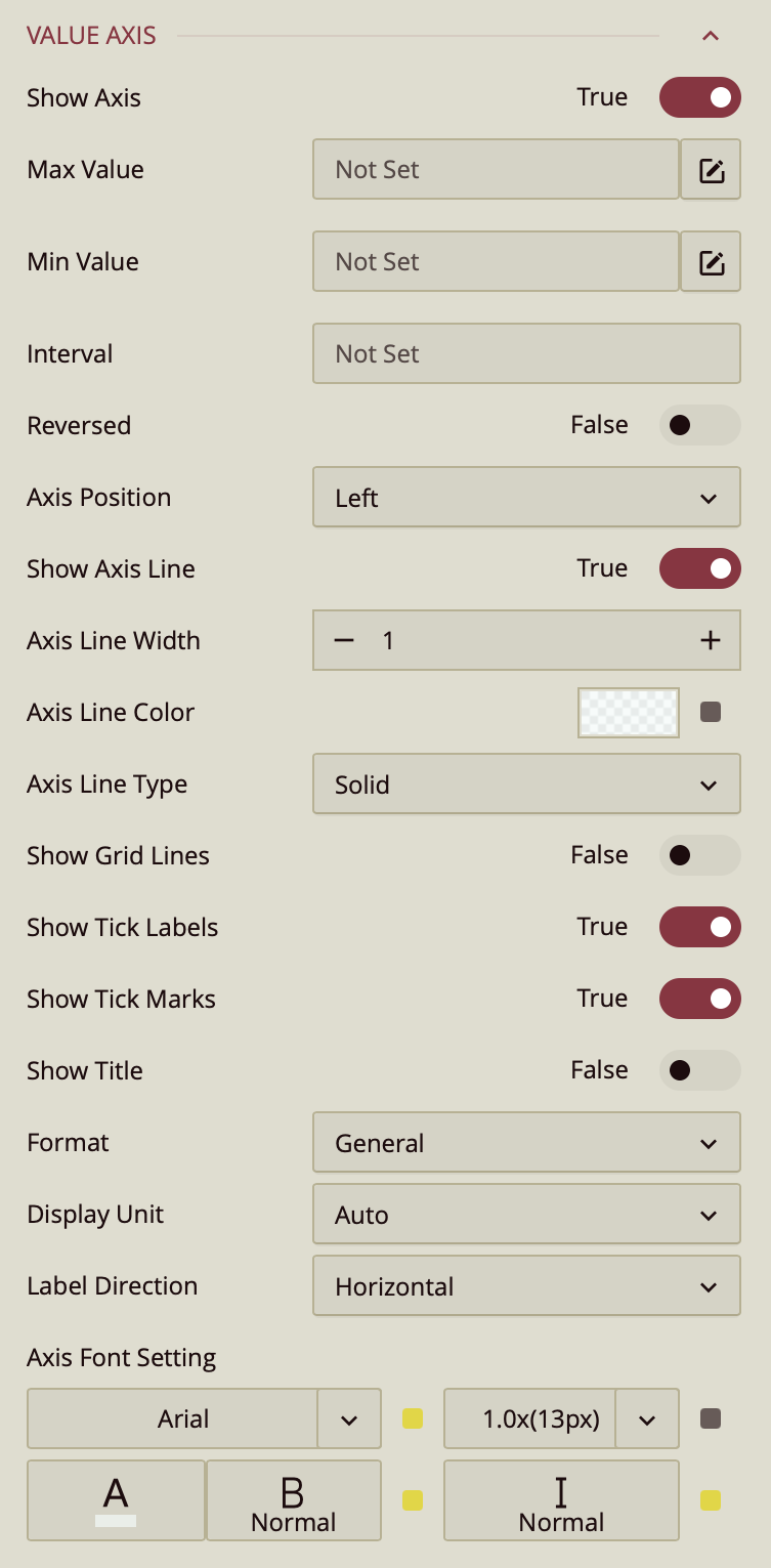 Format – Determines how axis values are displayed: General(default), Number, Currency, Percentage, or Custom.