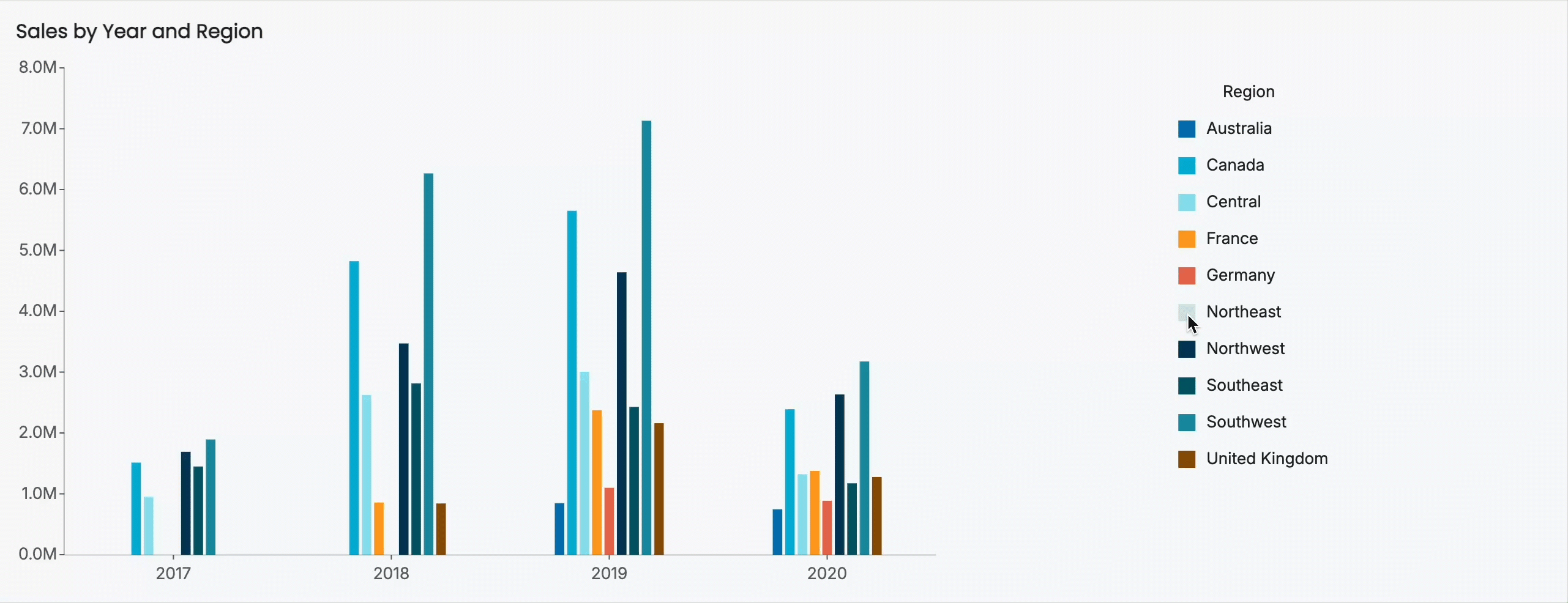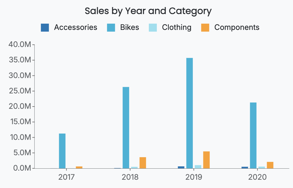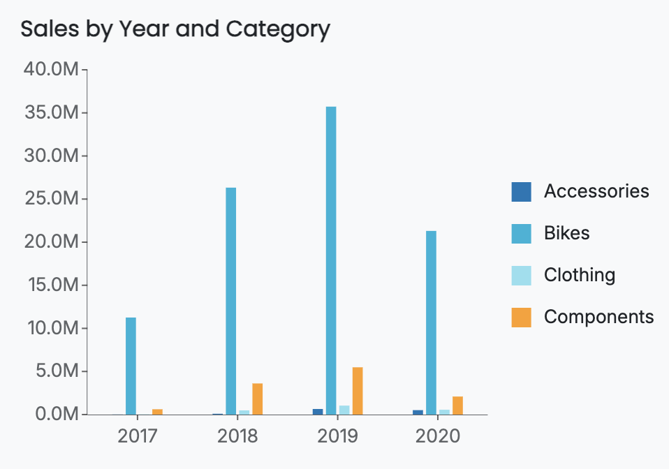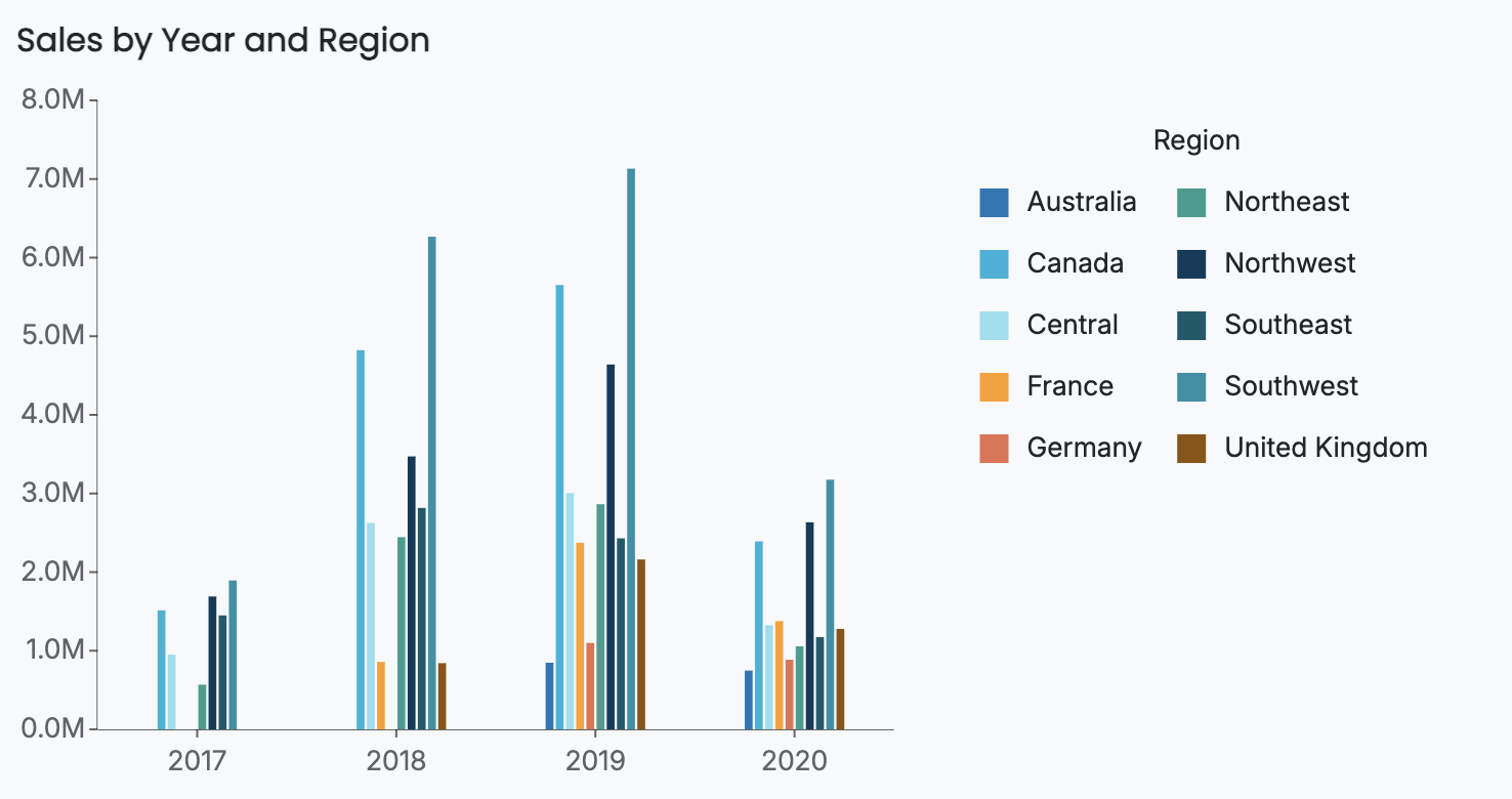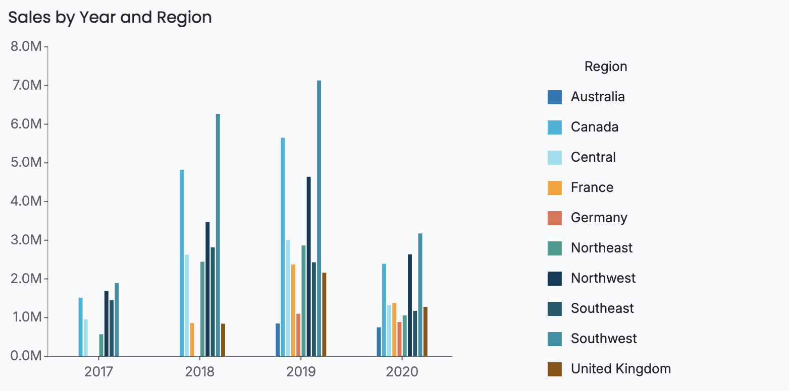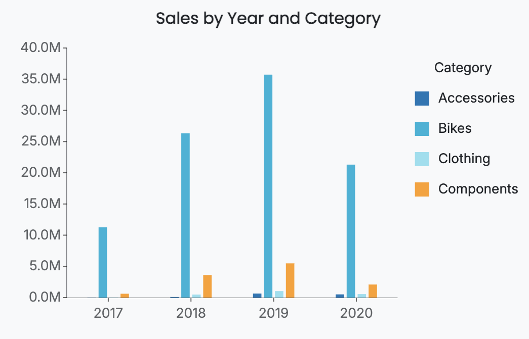 For example, if you want to visualize Sales by Year and by Product, the chart displays Year as the primary grouping and Product as the secondary grouping. This configuration typically produces what is known as a grouped chart.