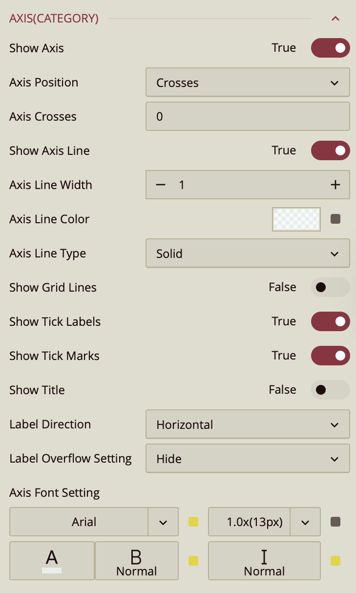 Show Axis Line: Enabled by default. Controls the visibility of the axis line. You can customize its line type(Solid or Dashed), color, and width.