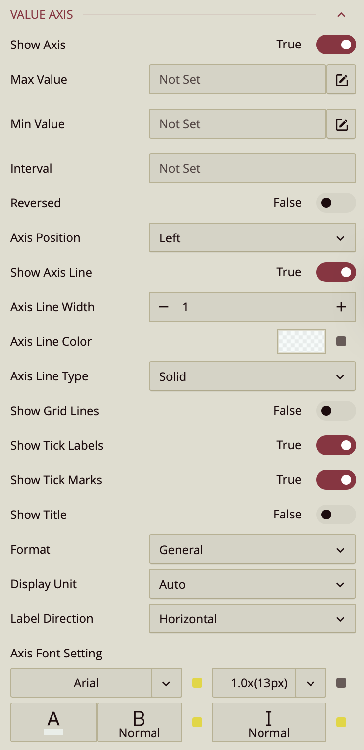 Axis Font Settings: Customize the axis text by choosing the font family, size, color, weight, and style.