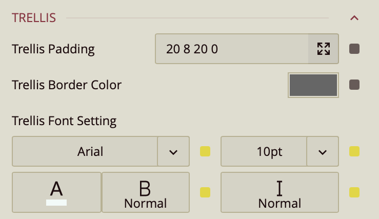 You can set the Padding around the Trellis Chart to control the spacing between the chart content and its edges. You can also define a Trellis Border Color to outline each panel of the trellis. Additionally, the Trellis Font Settings allow you to customize the font family, size, color, weight, and style of the text used in the trellis layout.
