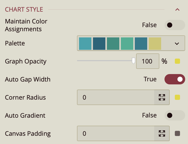 Auto Gap Width: Enabled by default. This controls the spacing between bars. To manually define the gap width, switch this setting to False.