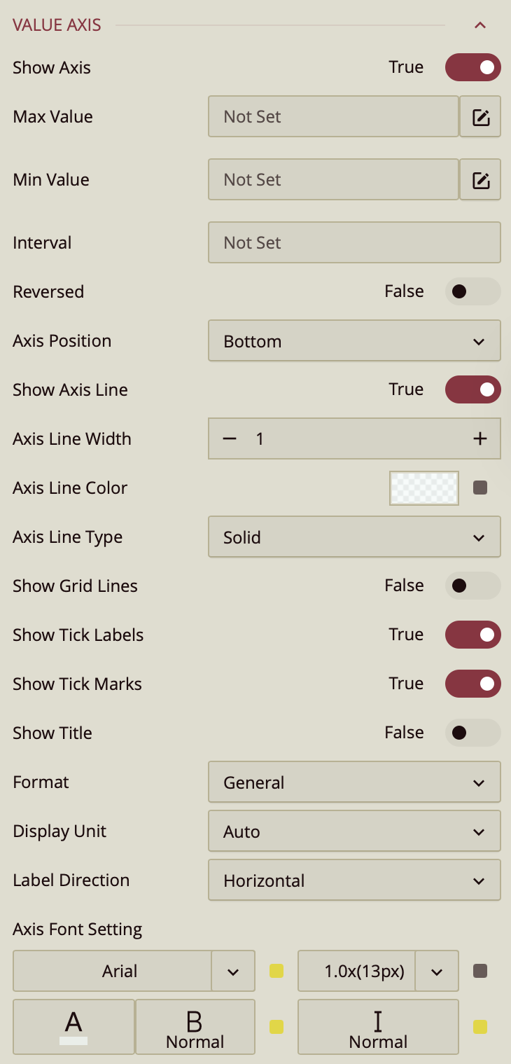 The Value (X) Axis settings let you configure the numerical axis of your chart, typically displayed horizontally.