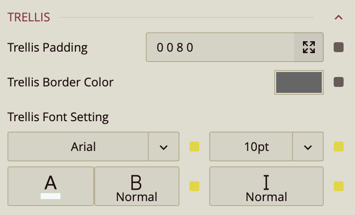 You can set the Padding around the Trellis Chart to control the spacing between the chart content and its edges. You can also define a Trellis Border Color to outline each panel of the trellis. Additionally, the Trellis Font Settings allow you to customize the font family, size, color, weight, and style of the text used in the trellis layout.