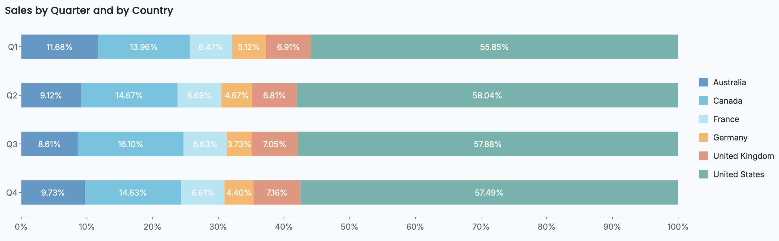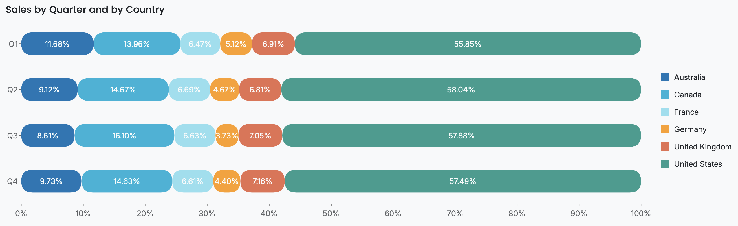 For example, a percent stacked bar chart may plot Sales in the Values slot. A quick function is applied to the Salesmeasure so the values are calculated as percentages of the total along the Axis (Category), ensuring that each bar represents 100% of its category. Quarter is bound to the Axis (Category) slot and Country to the Legend (Series) slot. Additionally, Show Data Label in the Inspector Panel is toggled to True so the percentage values are displayed directly on each stacked segment, making relative comparisons easier to interpret.