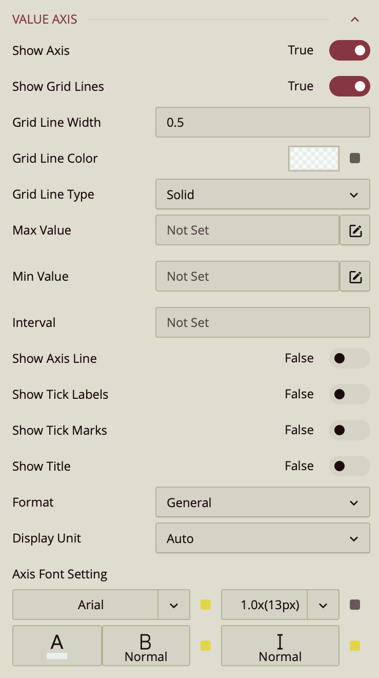 Show Axis – Toggle item. Displays or hides the value axis. True by default.