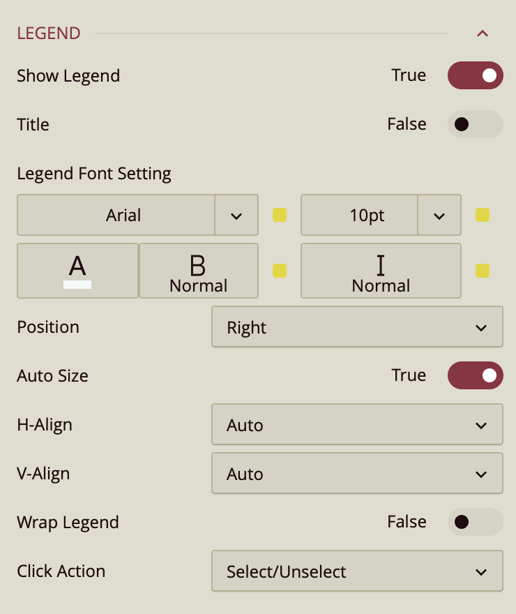 The legend is set to Auto Size by default. To manually define the legend size, disable this setting by setting Auto Sizeto False. You can also control the Horizontal and Vertical Alignment, which are both set to Auto by default but can be changed using dropdown options. To allow legend labels to wrap across lines, set the Wrap Legend option to True.