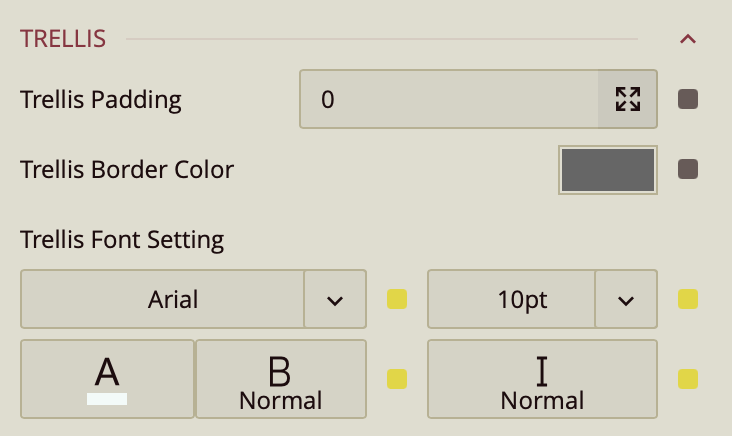 You can set the Padding around the Trellis Chart to control the spacing between the chart content and its edges. You can also define a Trellis Border Color to outline each panel of the trellis. Additionally, the Trellis Font Settings allow you to customize the font family, size, color, weight, and style of the text used in the trellis layout.