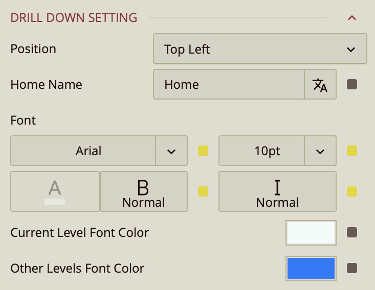 Current Level Font Color – Sets the color for the label of the currently active drill-down level, helping it stand out from other levels.