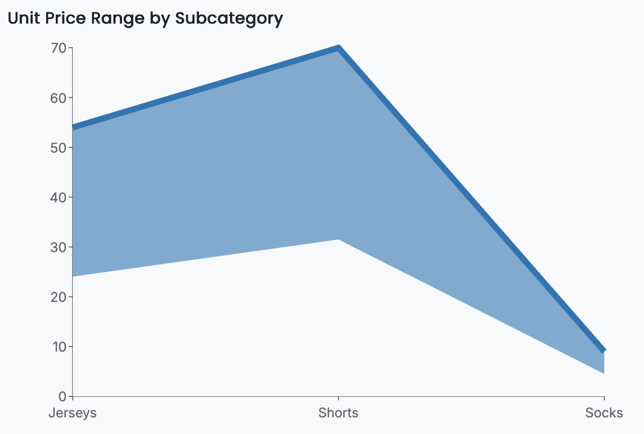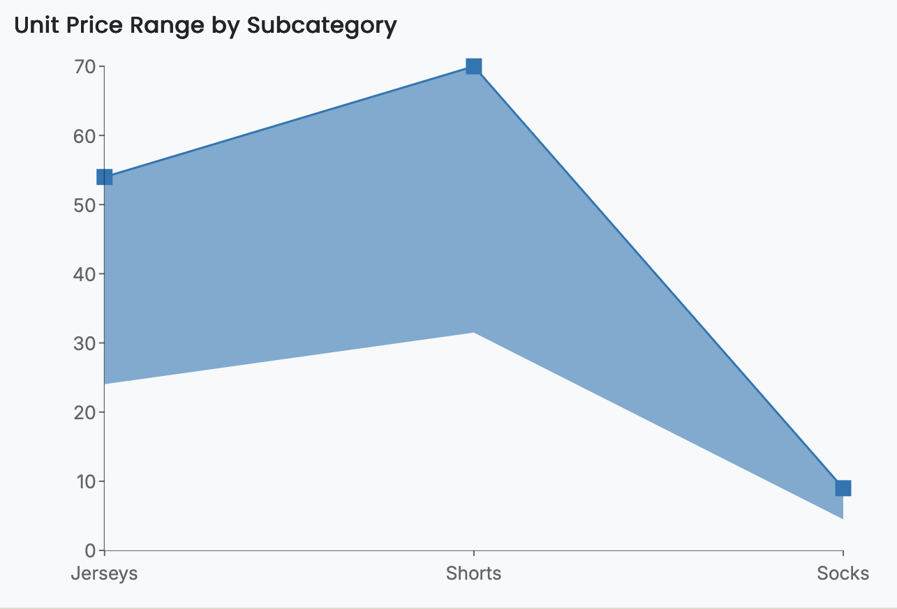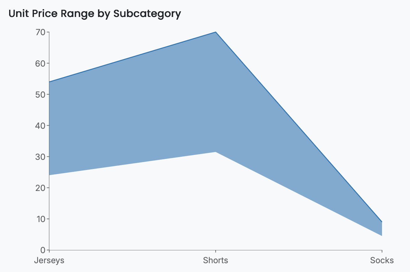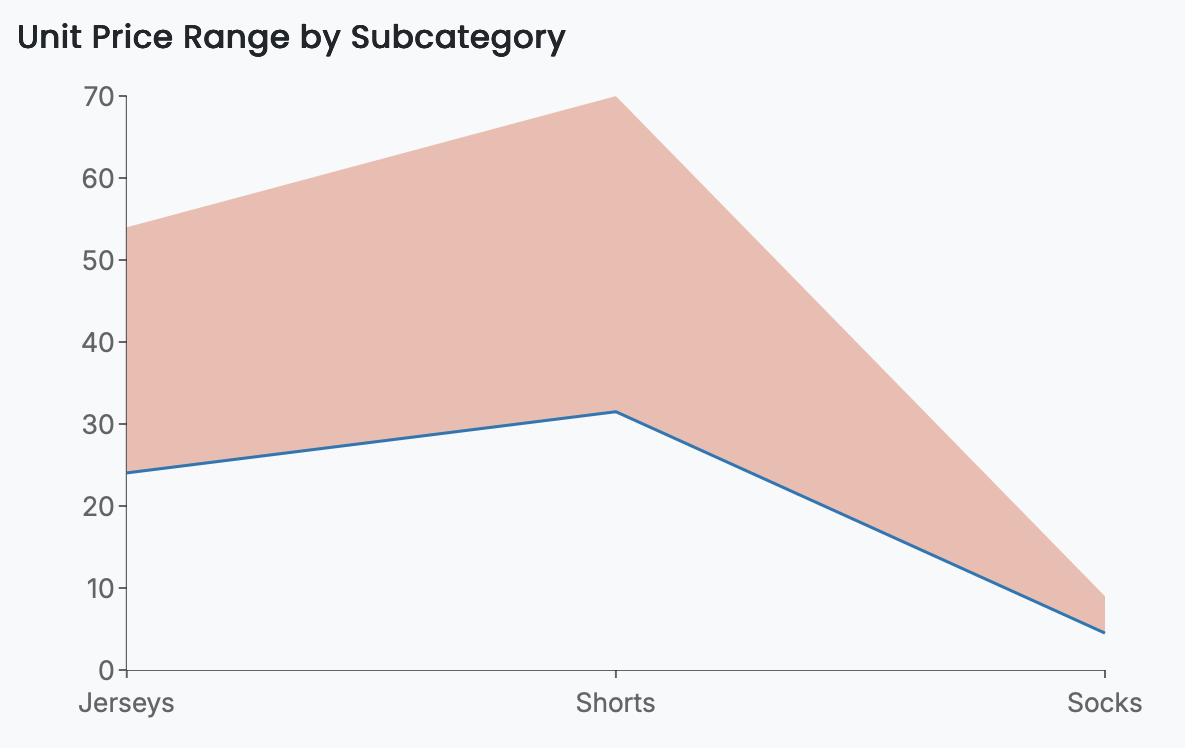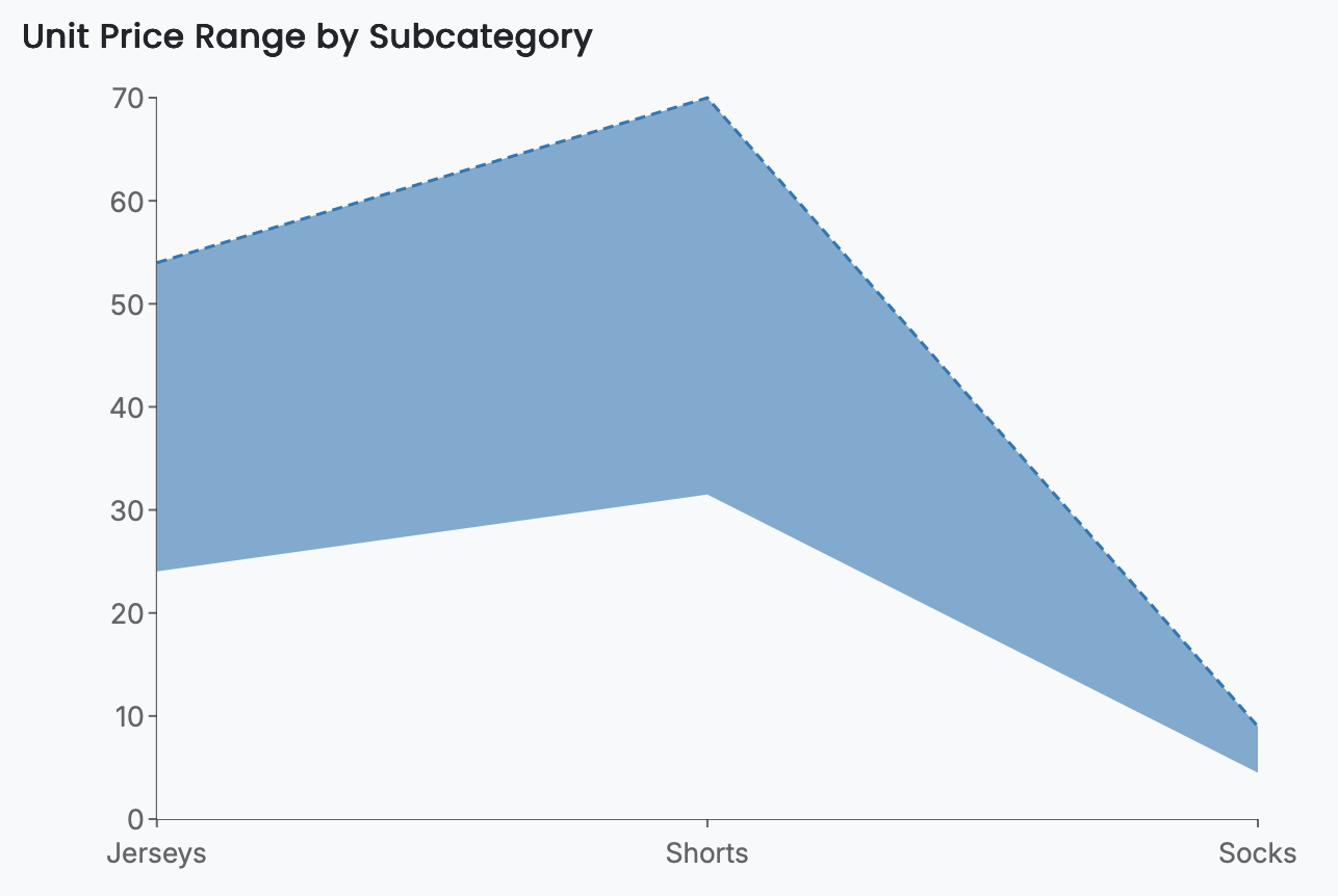For example, a simple range area chart may plot Unit Price in the Upper Value and Lower Value slots (using Max and Min aggregation, respectively) and Product Subcategory in the Axis (Category) slot (with the featured example filtered to Jerseys, Socks, and Shorts), producing a straightforward visualization of price variation across product subcategories.