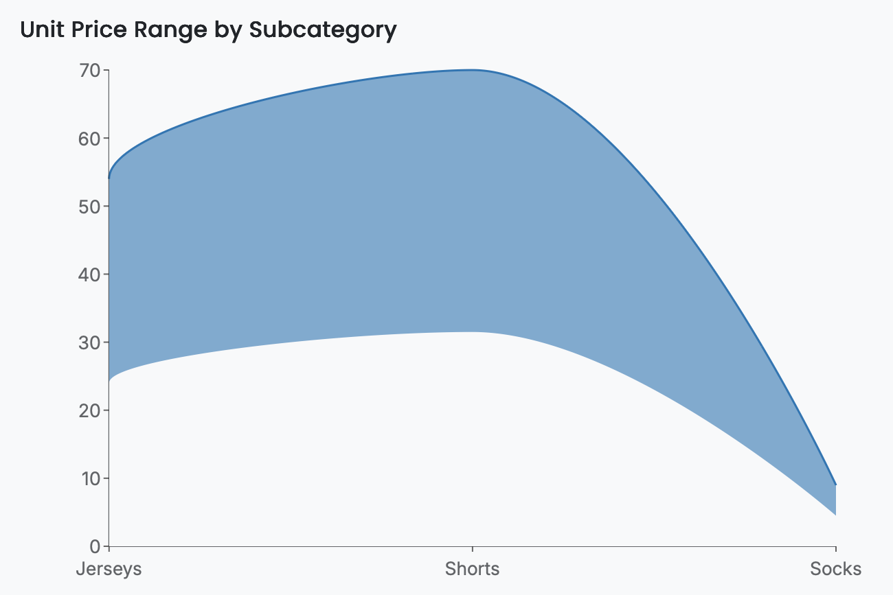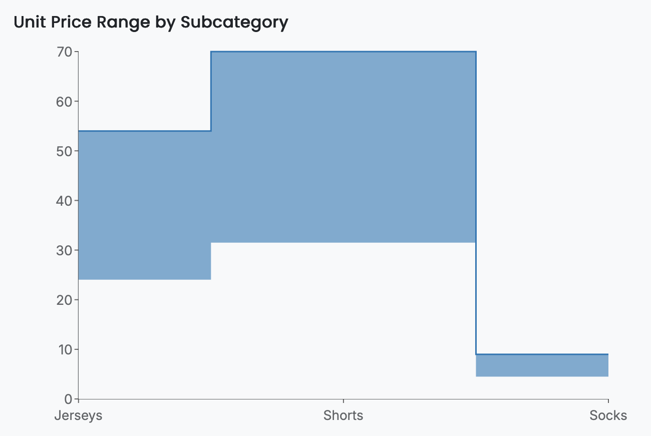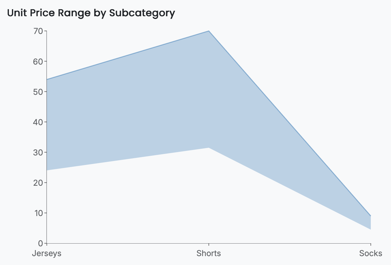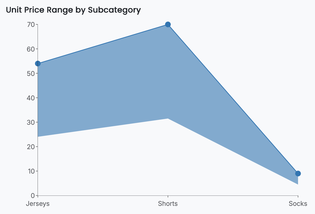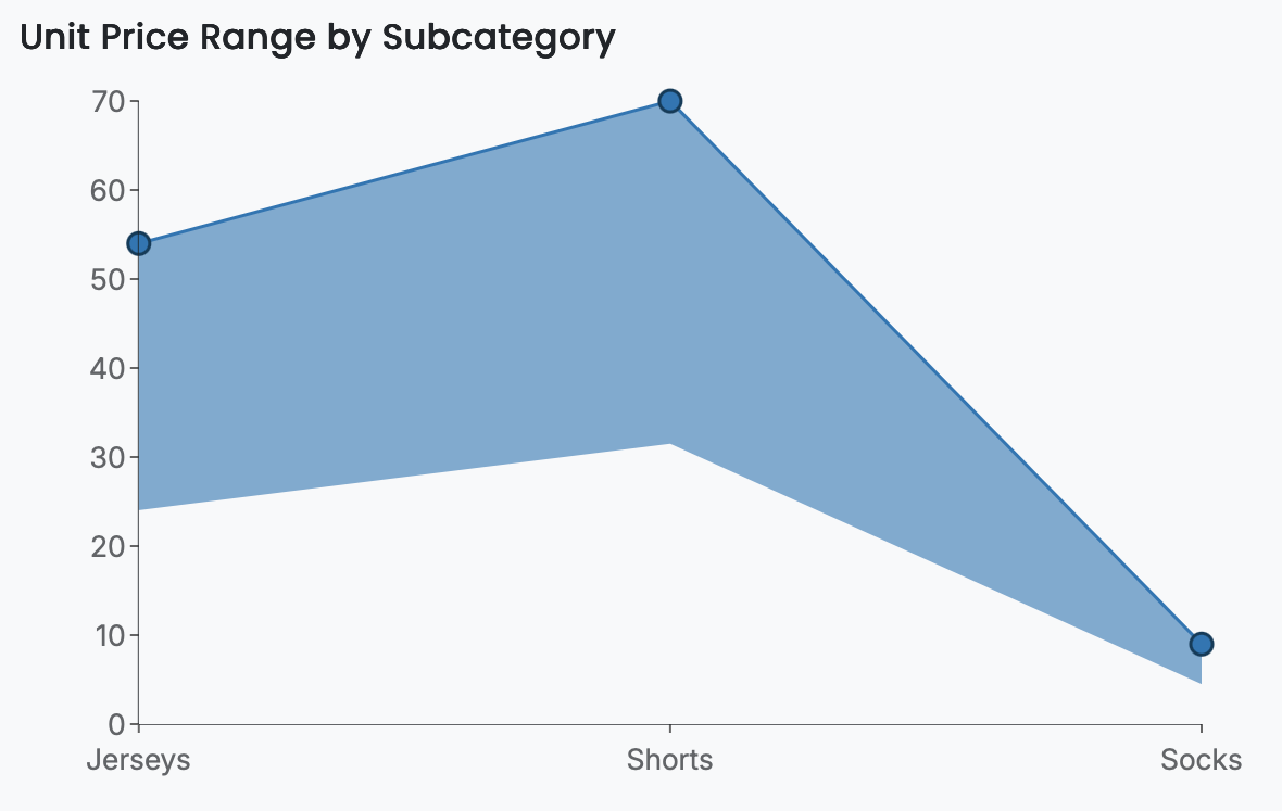For example, a simple range area chart may plot Unit Price in the Upper Value and Lower Value slots (using Max and Min aggregation, respectively) and Product Subcategory in the Axis (Category) slot (with the featured example filtered to Jerseys, Socks, and Shorts), producing a straightforward visualization of price variation across product subcategories.