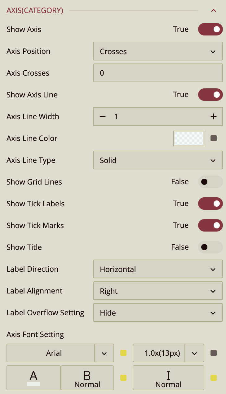Show Axis Line: Enabled by default. Controls the visibility of the axis line. You can customize its line type(Solid or Dashed), color, and width.