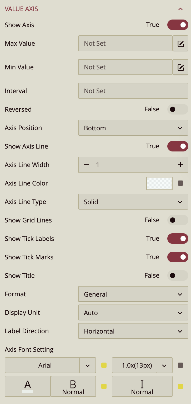 The Value (X) Axis settings let you configure the numerical axis of your chart, typically displayed horizontally.