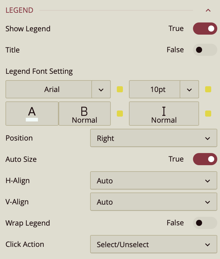 The legend is set to Auto Size by default. To manually define the legend size, disable this setting by setting Auto Size to False. You can also control the Horizontal and Vertical Alignment, which are both set to Auto by default, but can be changed using dropdown options. To allow legend labels to wrap across lines, set the Wrap Legend option to True.