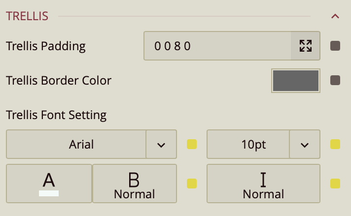 You can set the Padding around the Trellis Chart to control the spacing between the chart content and its edges. You can also define a Trellis Border Color to outline each panel of the trellis. Additionally, the Trellis Font Settings allow you to customize the font family, size, color, weight, and style of the text used in the trellis layout.