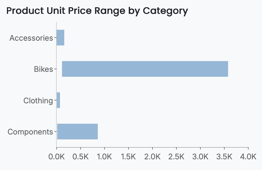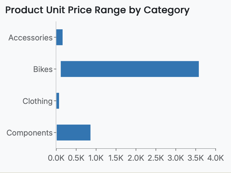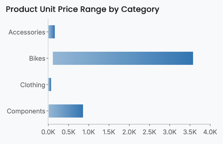 For example, a simple range bar chart may plot Unit Price in the Upper Value and Lower Value slots (using Max and Min aggregation, respectively) and Product Category in the Axis (Category) slot, producing a straightforward visualization of price variation across product categories.
