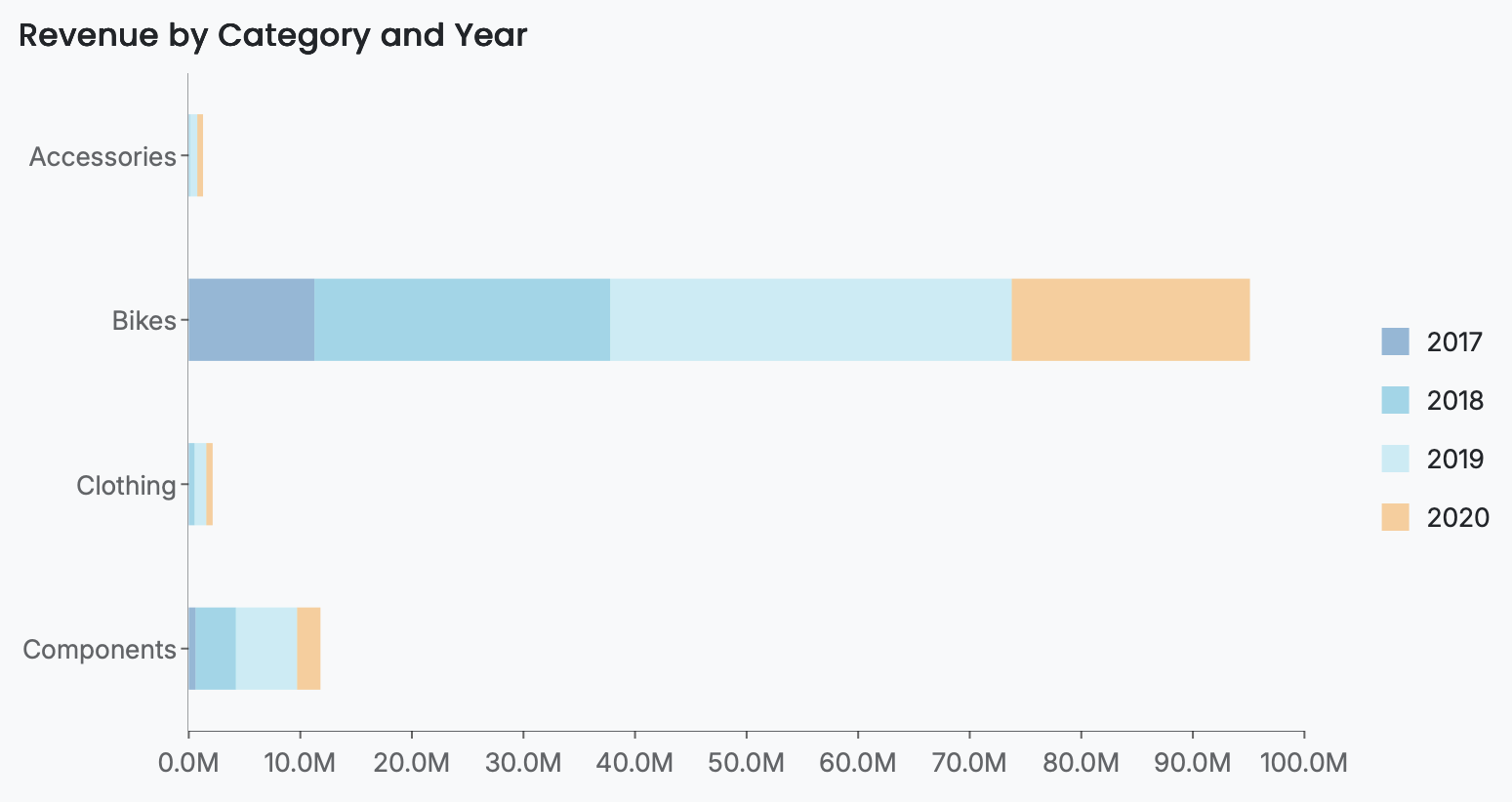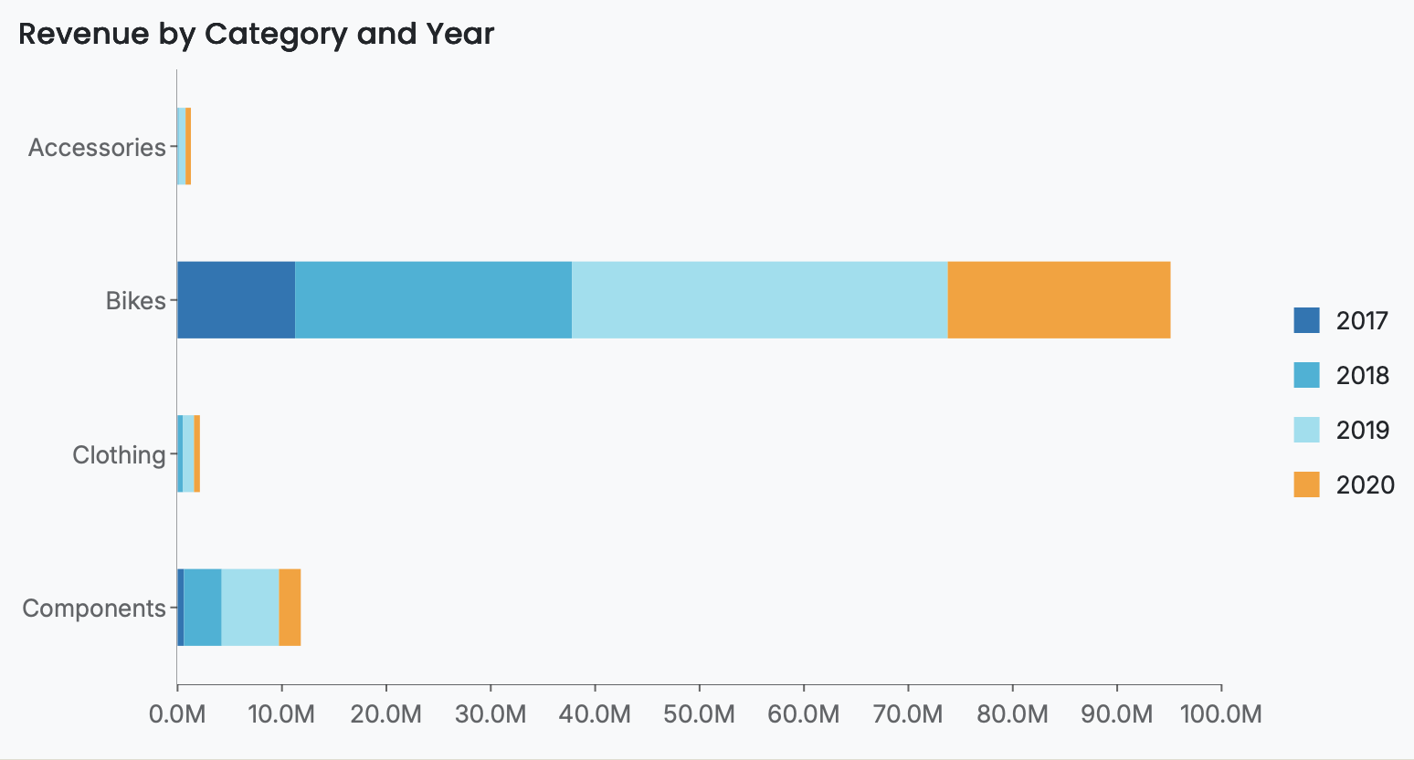 Values – The numeric measure that determines the length of each bar along the horizontal axis. When multiple series are present, the values for each series are stacked horizontally to form a single total per category.