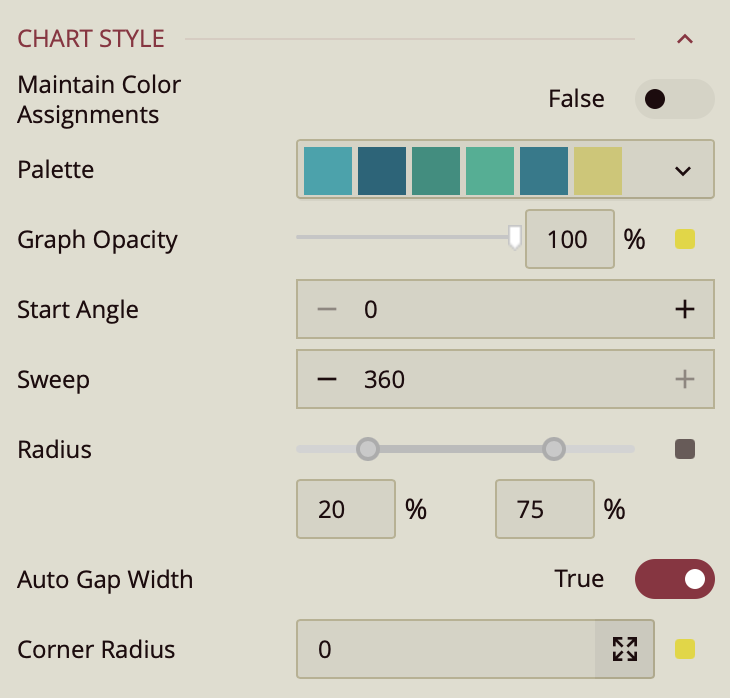 Radius: Determines the size of the chart from the center outward. The default range is from 0 to 75, where 0 is the inner radius and 75 is the outer radius. Setting the inner radius to a value greater than 0 creates a donut-style appearance.
