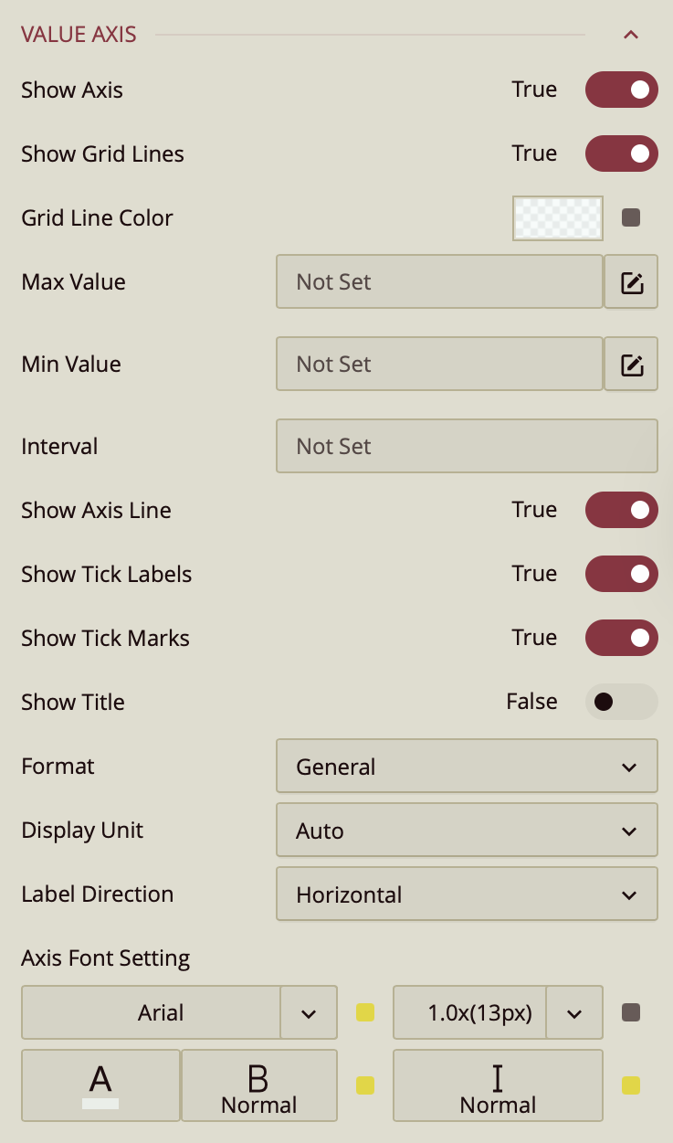 Show Axis – Toggles the display of the value axis. When off, all axis elements, including labels, lines, and ticks, are hidden.