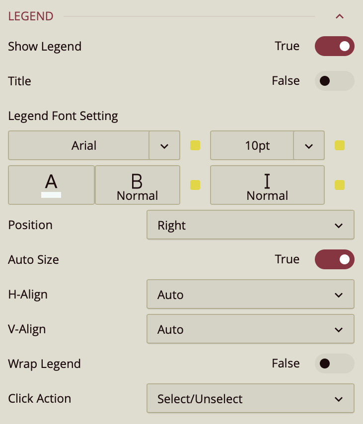 The legend is set to Auto Size by default. To manually define the legend size, disable this setting by setting Auto Sizeto False. You can also control the Horizontal and Vertical Alignment, which are both set to Auto by default but can be changed using dropdown options. To allow legend labels to wrap across lines, set the Wrap Legend option to True.