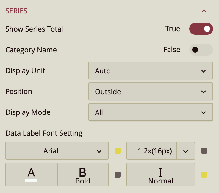 To show the combined total of all series for a category, enable the Show Series Total option. This adds an extra “total” bar for each category, representing the cumulative value of all series.