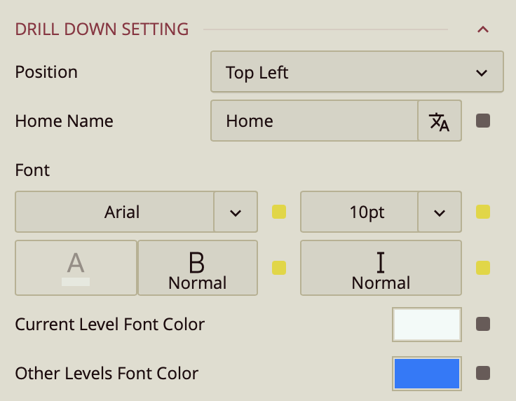 Other Levels Font Color – Sets the color for labels representing all non-active drill-down levels, allowing users to visually distinguish between the active and inactive levels in the navigation path.