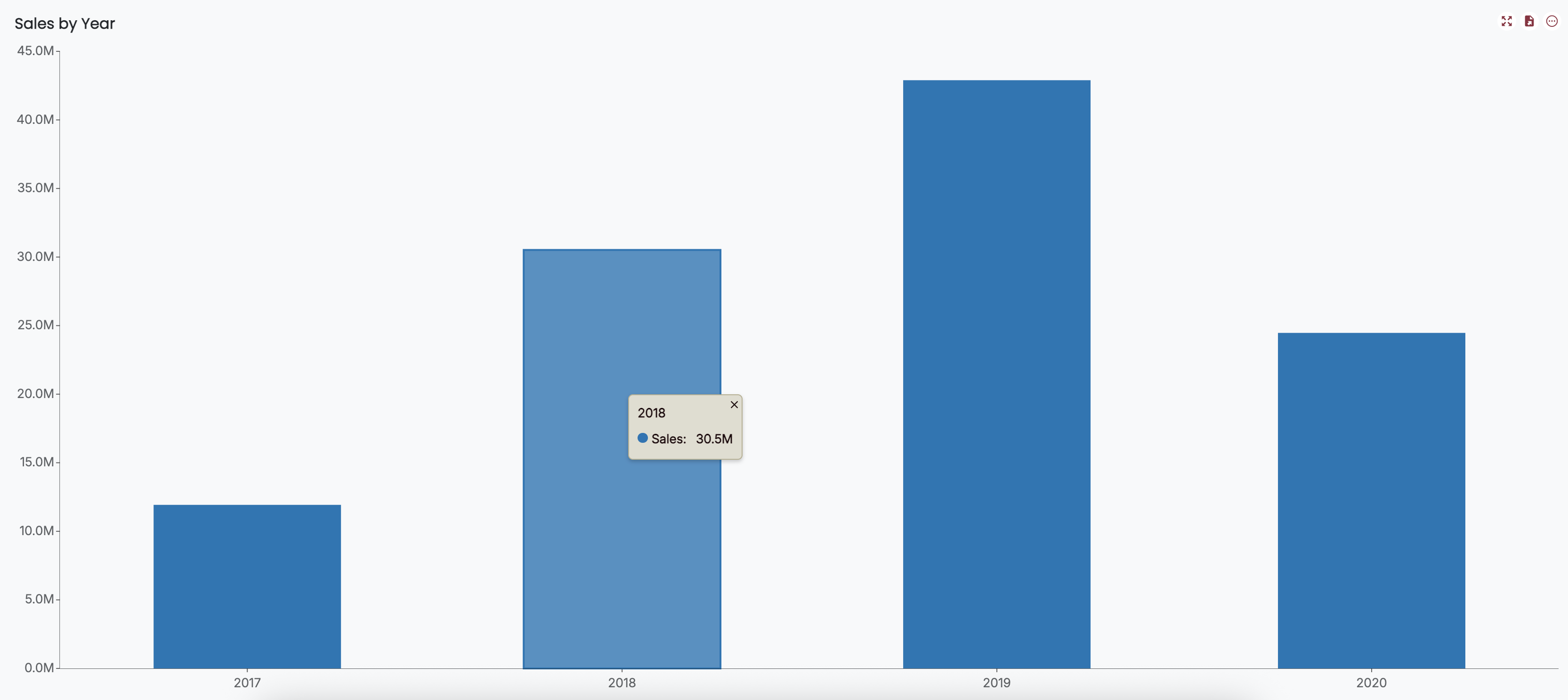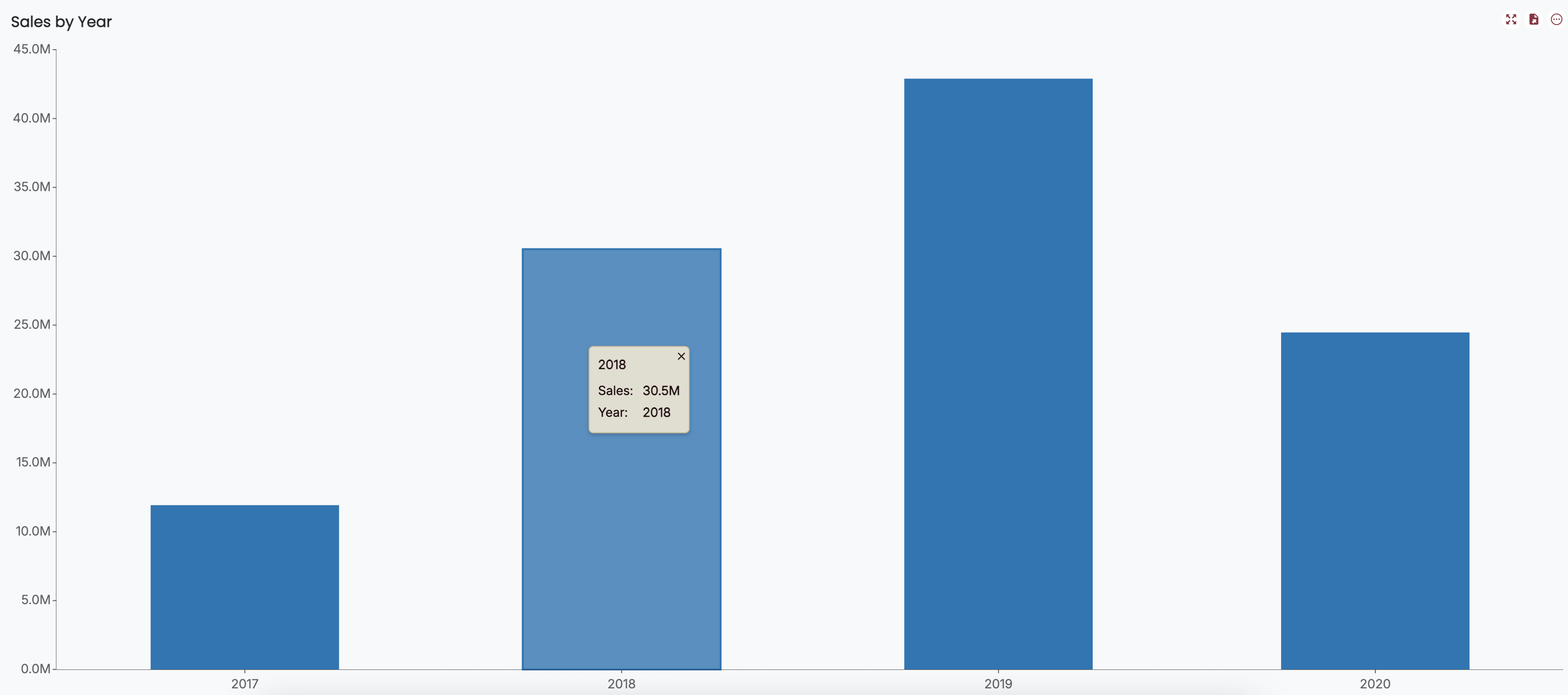 The is enabled by default and provides a summary for a data point in your chart. By default, it displays the data bound in the Data Binding tab. For example, in a column chart showing sales by year, the tooltip will display the sales amount for each column along with the corresponding year.