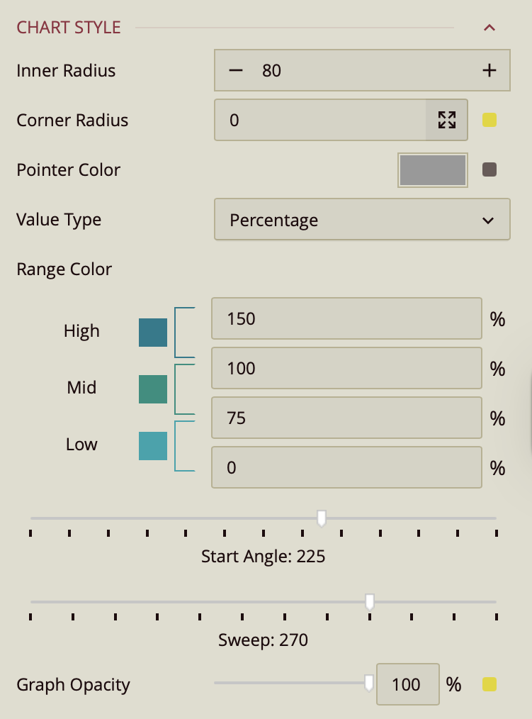 Inner Radius – Enter a numerical value to define the size of the gauge’s hollow center. Smaller values make the gauge ring thicker, while larger values create a thinner ring.