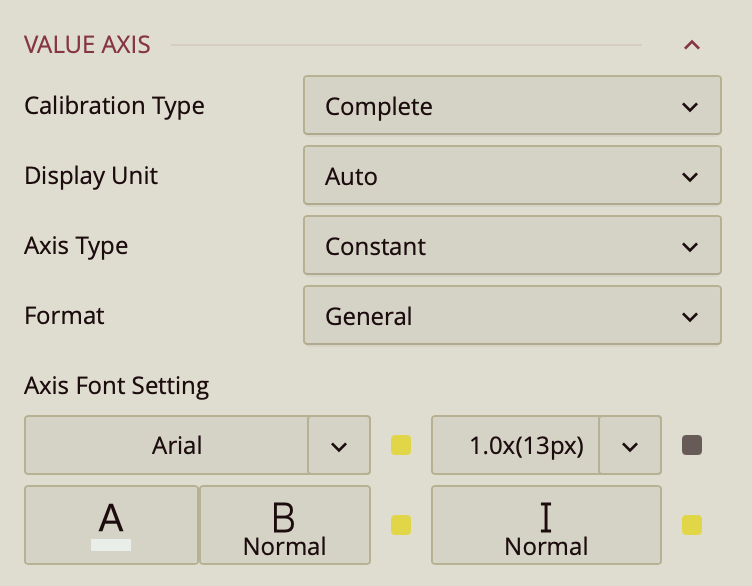 The Value Axis controls how the gauge scale is displayed and formatted.