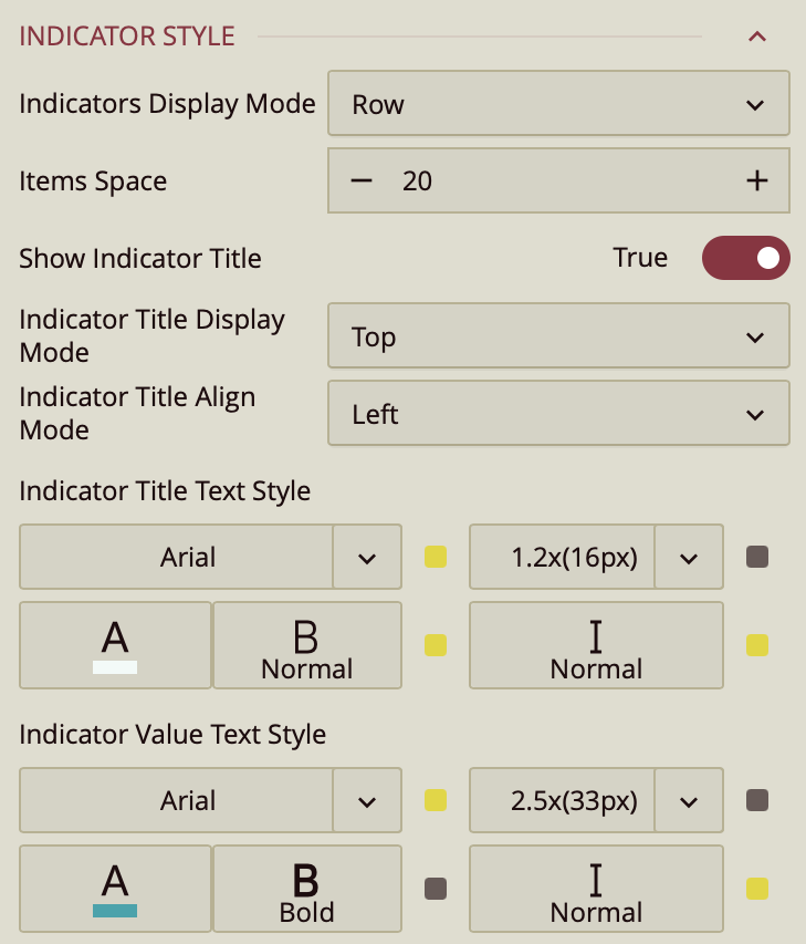 The Indicator Style properties allow you to customize how values and text are displayed on KPI cards or indicators.