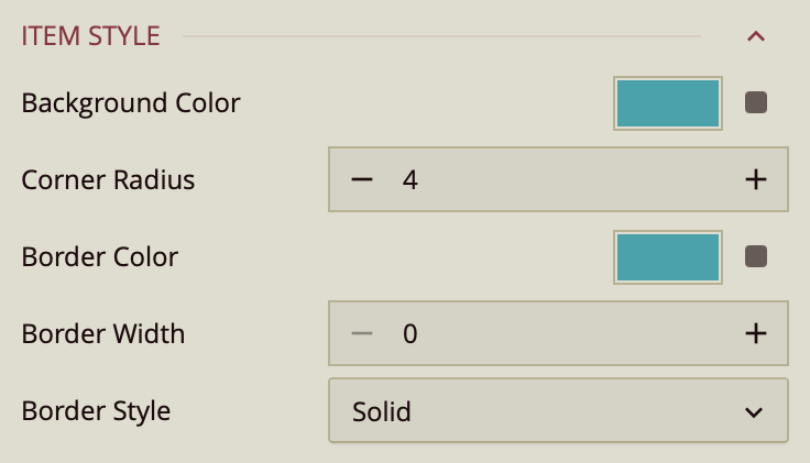 Border Color – Enter a color value or select a default from the palette to define the item’s border color.