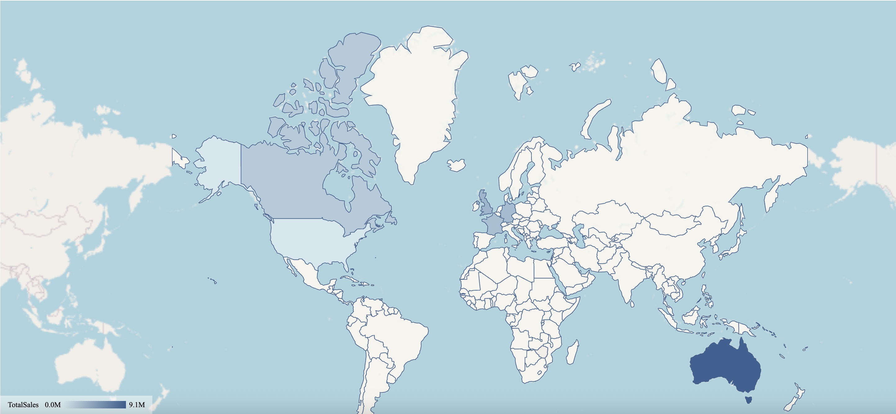 Bind a measure (such as sales, population, or density) to control the shading of each region. Higher or lower values are represented with stronger or lighter color intensity, making it easy to identify patterns and trends across regions.
