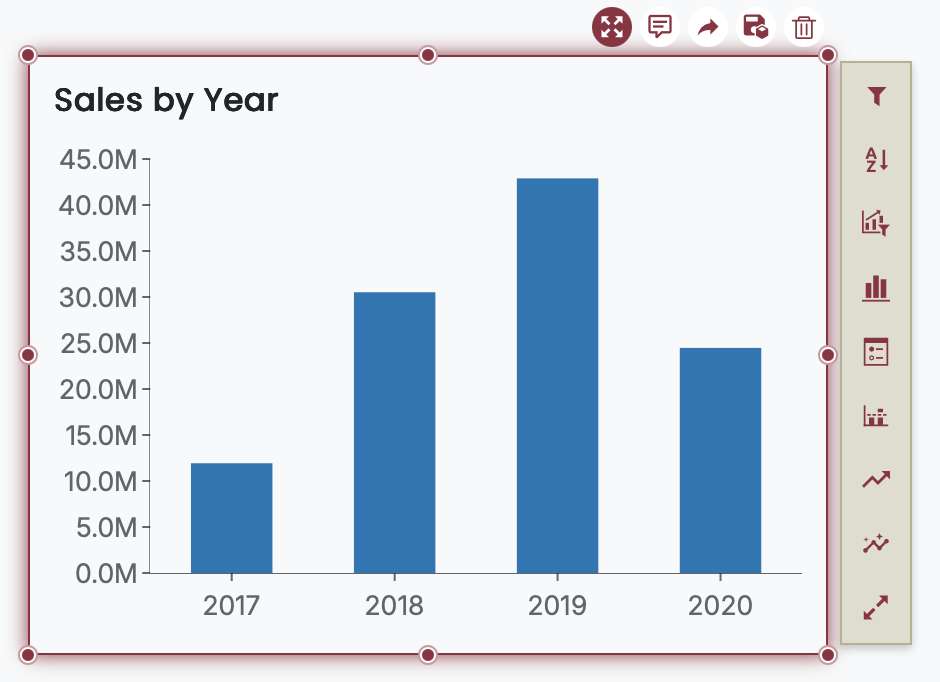The Focus button is one of the data exploration buttons that appears when a scenario (such as a chart or table) is selected in a dashboard. When clicked, it enlarges the selected scenario to fill the entire dashboard canvas, helping users analyze data in greater detail without distractions from other components.