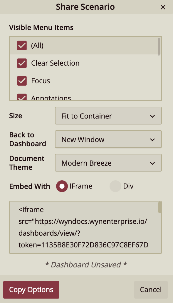 Sharing a scenario allows you to embed a specific view of your dashboard into another application or webpage. This lets you control which actions are available to viewers and how the scenario appears within the host environment.