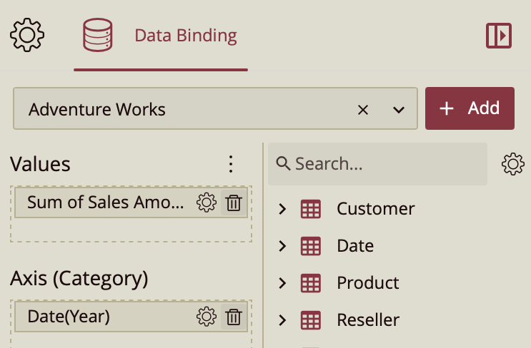 Once your data source is selected, all data attributes appear in the Data Binding tab. You can drag the following to the binding slots of the chart: