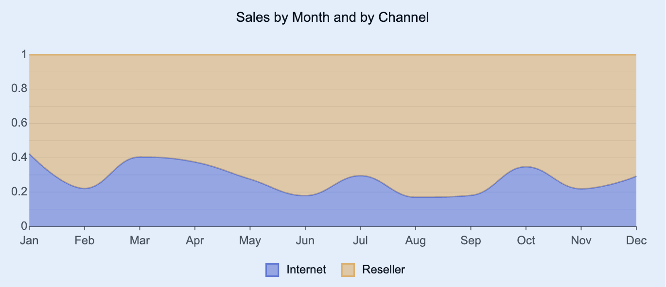 Legend (Series): The dimension that defines separate areas within the chart. Each unique value in this field generates an individual stacked area, allowing proportional comparisons between multiple categories.