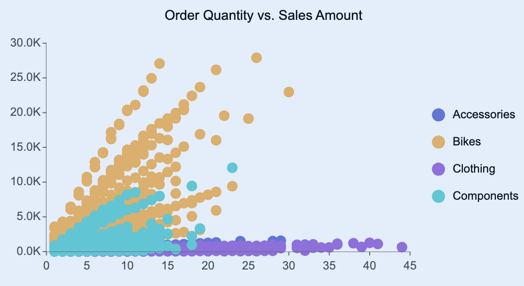 You can use scatter plots to visualize how one measure changes in relation to another — for example, exploring the relationship between product cost and sales amount, customer spending and number of purchases, or order quantity and profit.