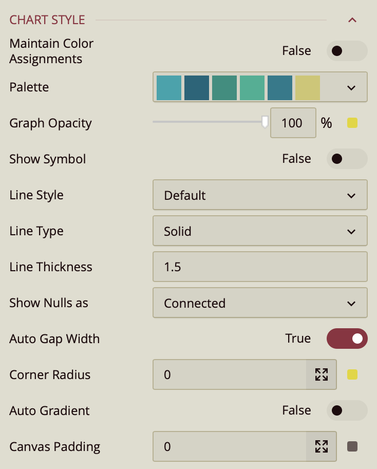 Canvas Padding – Controls the amount of blank space between the plotted data area and the edges of the chart canvas. Accepts a numerical value.