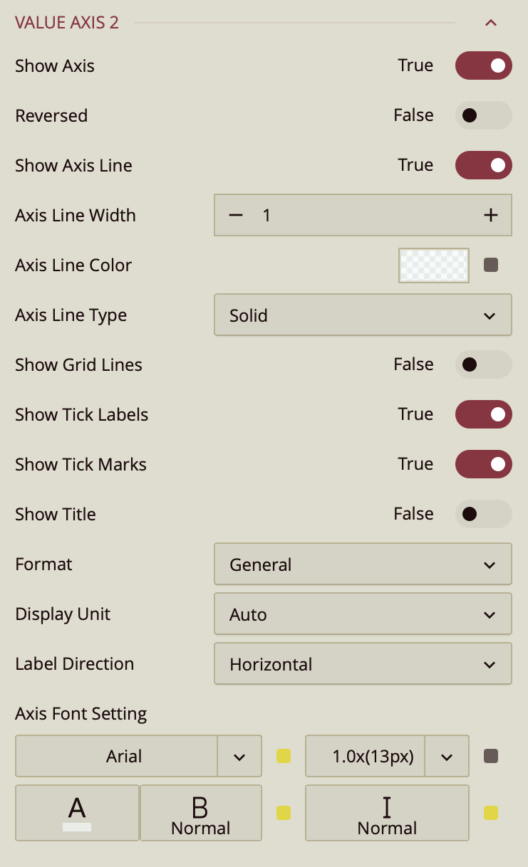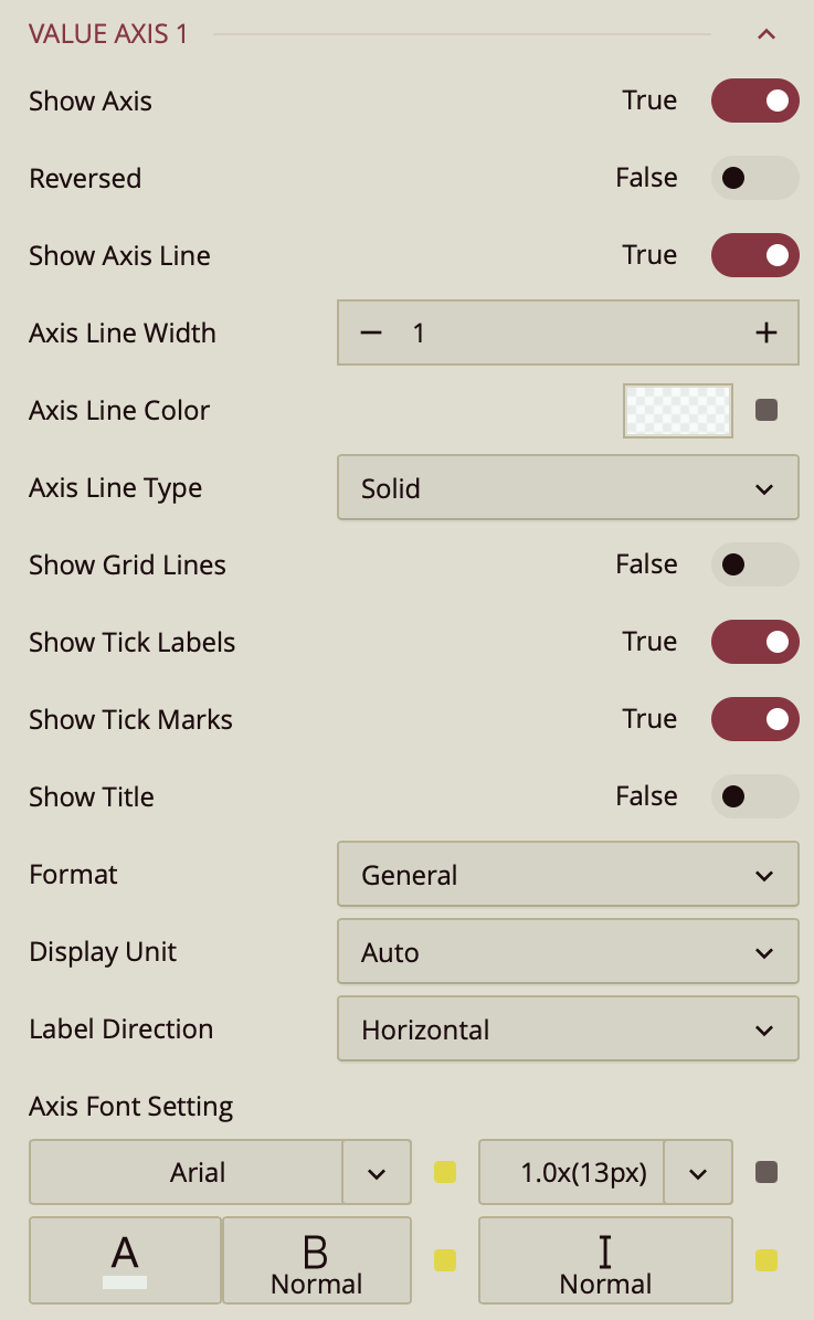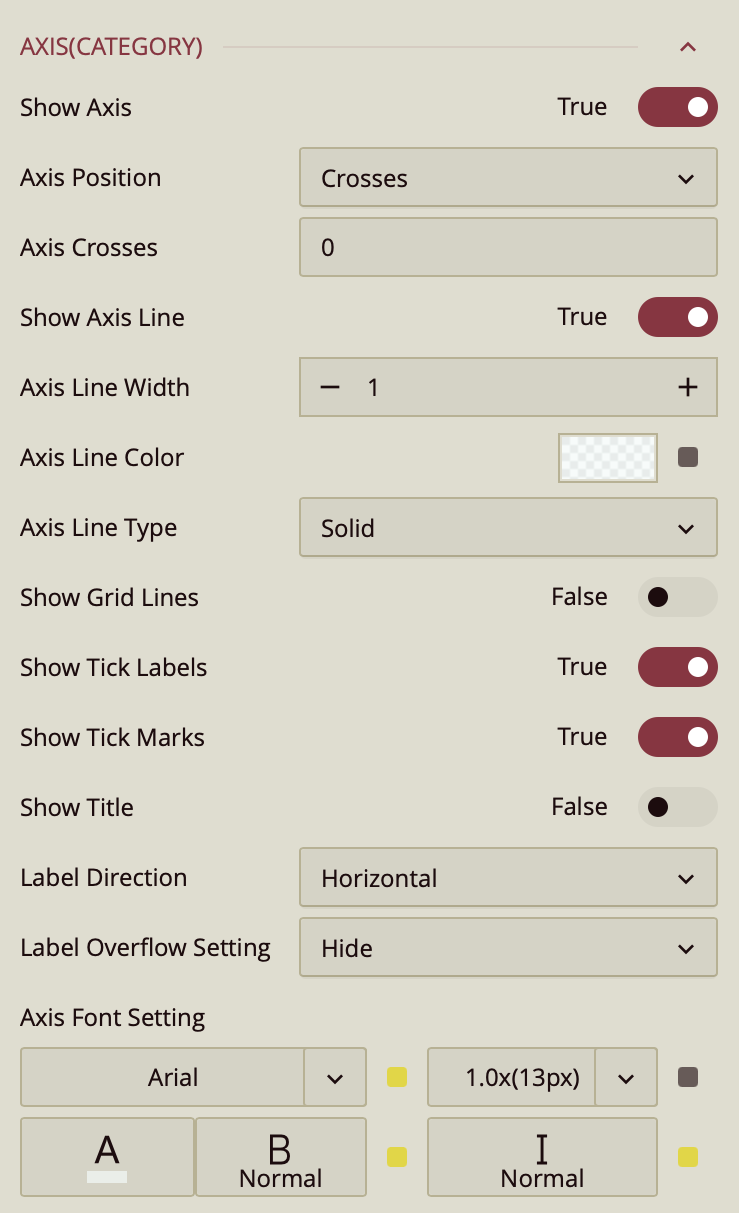 Axis Line Width / Color / Type – Control the thickness, color, and style (solid or dashed) of the axis line.