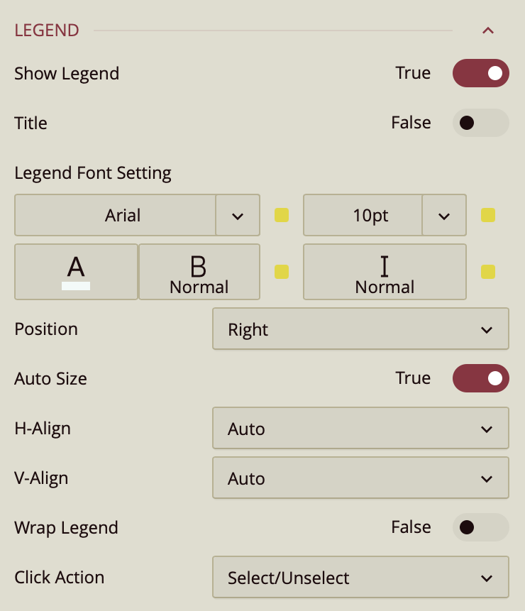 The legend is set to Auto Size by default. To manually define the legend size, disable this setting by setting Auto Sizeto False. You can also control the Horizontal and Vertical Alignment, which are both set to Auto by default but can be changed using dropdown options. To allow legend labels to wrap across lines, set the Wrap Legend option to True.