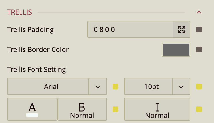 You can set the Padding around the Trellis Chart to control the spacing between the chart content and its edges. You can also define a Trellis Border Color to outline each panel of the trellis. Additionally, the Trellis Font Settings allow you to customize the font family, size, color, weight, and style of the text used in the trellis layout.