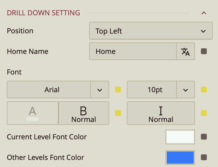 Current Level Font Color – Sets the color for the label of the currently active drill-down level, helping it stand out from other levels.