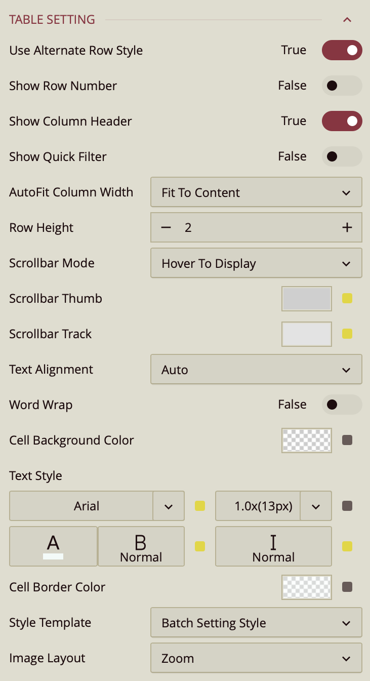Use Alternate Row Style – Toggles alternating background colors for rows to improve readability. Enabled (True) by default.