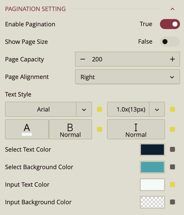 Text Style – Configures font family, size, color, weight, and style (normal or italic) for pagination text.