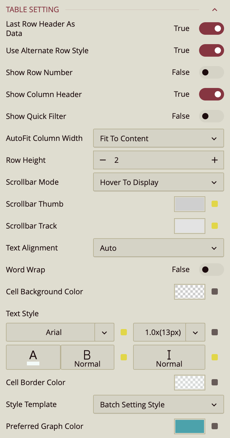 Use Alternate Row Style – Toggles alternating background colors for rows to improve readability. Enabled (True) by default.