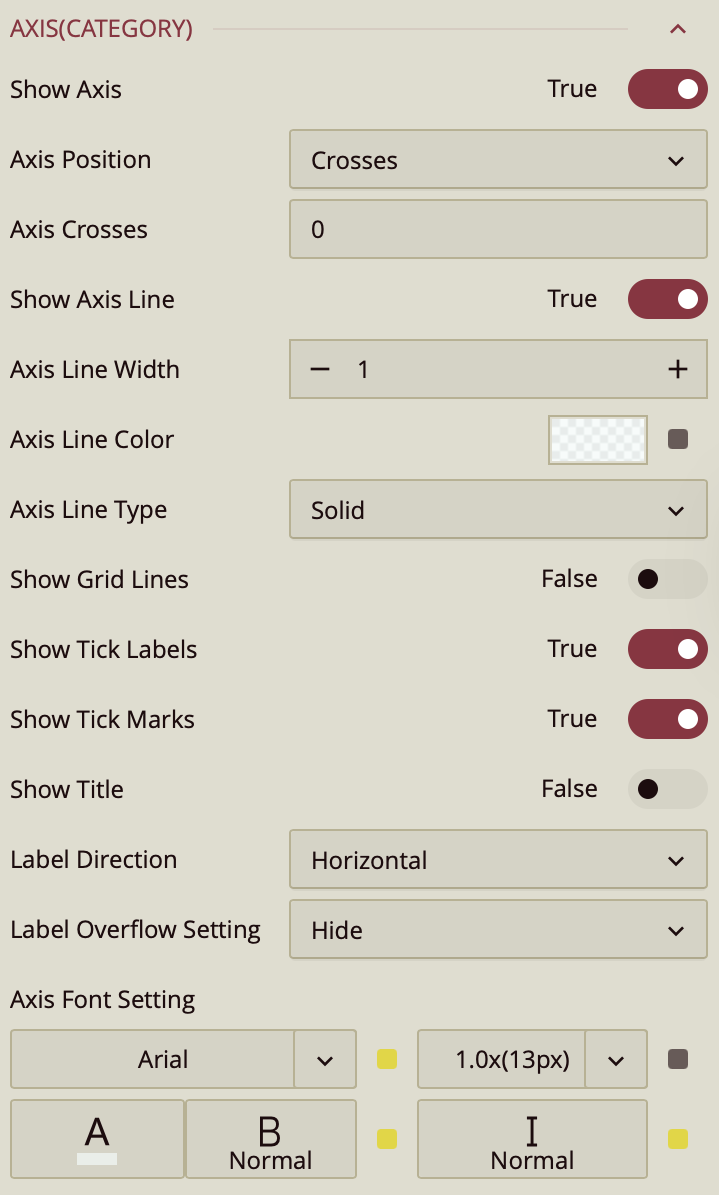Show Axis Line: Enabled by default. Controls the visibility of the axis line. You can customize its line type(Solid or Dashed), color, and width.